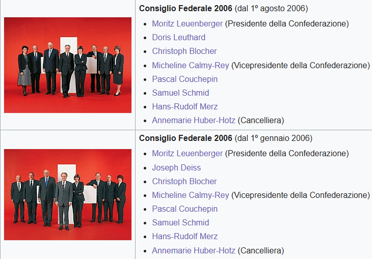 Plr: Pascal Couchepin, Hans-Rudolf Merz, Annemarie Huber-Hotz Ps: Moritz Leuenberger, Micheline Calmy-Rey Udc: Christoph Blocher, Samuel Schmid Ppd: Doris Leuthard/Joseph Deiss