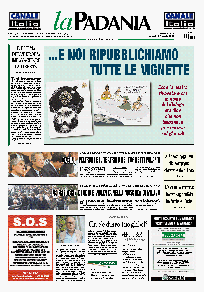 Il quotidiano “La Padania” (organo della Lega Nord” è uscito in prima pagina con il seguente titolo: “E noi ripubblichiamo tutte le vignette“. Si riferivano alle vignette danesi che così tante proteste hanno scatenato presso i mussulmani. Nel articolo interno hanno fatto presente che le stesse vignette le avevano già pubblicate e hanno intenzione di continuare a farlo fino a quando il mondo mussulmano non si accorgerà di loro e protesterà anche contro l’Italia. Da questo si evincono due cose. Primo: non li considera nessuno. Secondo: vogliono utilizzare questo stato di cose per fare la loro campagna elettorale e prendereil voto di molti degli pseudo-razzisti che ci sono in giro. Avete presente quelli che qualche giorno fa hanno riempito il post del sito di France Soir che parlava proprio delle vignette danesi e che era stato messo nell’indice di Libero. … si proprio loro…