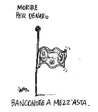 «Io non sono d’accordo su questa medaglia», dice la Sgrena a proposito del riconoscimento assegnato al contractor ucciso dai ribelli iracheni. «Sono stata una di quelle che ha manifestato in piazza per la liberazione dei quattro ostaggi, però penso che si debbano fare delle differenze: un conto è se uno va in Iraq per un’azione nobile, un conto se uno va come mercenario; perché chi va per guadagnare dei soldi facendo il servizio di sicurezza, chiamiamolo come vogliamo, è un mercenario. Quindi io penso che anche se è morto dicendo “vi faccio vedere come muore un italiano”, questo non possa essere un motivo sufficiente per meritare un riconoscimento di questo tipo. Allora perché non dare una medaglia al giornalista Enzo Baldoni? Inoltre non si può paragonare alla morte di Calipari, avvenuta sul campo mentre liberava delle persone». A sinistra una vignetta di Vauro all’indomani della morte di Quattrocchi. Metà Italia che Quattrocchi fosse un mercenario lo ha sempre pensato.