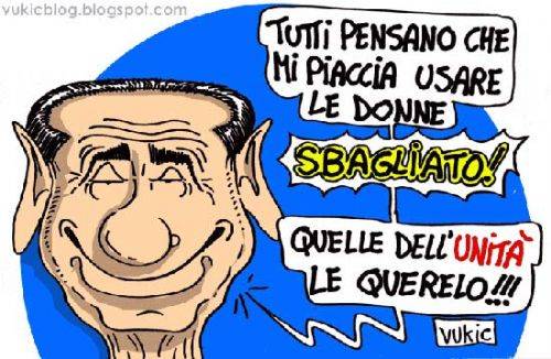 Berlusconi chiede due milioni all’Unità, nonché una pena pecuniaria di 200.000 euro ciascuna per il direttore responsabile Concita De Gregorio, le giornalista Natalia Lombardo e Federica Fantozzi, l’opinionista Maria Novella Oppo e la scrittrice Silvia Ballestra. Il tutto per articoli ed opinioni pubblicate tra il 13 luglio e il 6 agosto a proposito della vicende delle escort. L’intenzione del premier, fanno sapere ambienti di governo, é di devolvere l’eventuale ricavato della causa civile all’ospedale San Raffaele di Milano. “Introduce il reato di lesa maestà, vuole chiuderci”, replicano invece dal