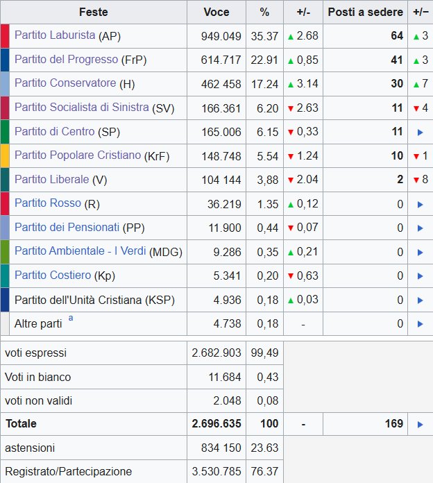 Al secondo posto il Partito del Progresso di Siv Jensen, mentre al terzo il Partito Conservatore di Erna Solberg.