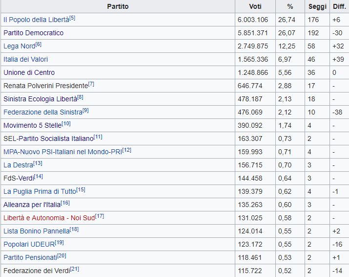 Sale, anzi decolla, il MoVimento 5 stelle di Beppe Grillo: ha raccolto 390 mila consensi nelle 5 regioni in cui si è presentato e se in Emilia Romagna è arrivato al 6%, in Piemonte il suo 3,7% è stato determinante per la sconfitta di Mercedes Bresso, battuta dal leghista Cota di 0,42 punti. Altro grande vincitore è l’astensionismo: con un italiano su tre assente dalle urne, ha fatto segnare il record nella storia della Repubblica. Tuttavia l’effetto punizione per il governo dato dall’astensionismo di massa, in questi giorni ribattezzato “effetto Sarkozy”, non ha colpito. Tre i fattori dello scampato pericolo individuati nello studio dell’Istituto Cattaneo: l’assenza talk show ha evitato il dibattito sulla crisi; le amministrative sono arrivate nella prima metà della legislatura; la Lega è riuscita a mobilitare il suo popolo.