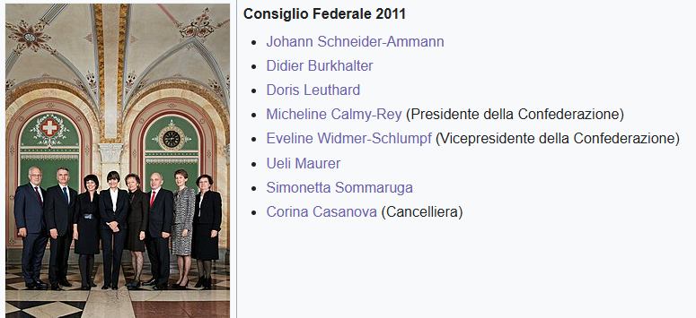 Plr: Didier Burkhalter, Johann Schneider-Ammann Ps: Micheline Calmy-Rey, Simonetta Sommaruga Ppd: Doris Leuthard, Corina Casanova Udc: Ueli Maurer Pbd: Eveline Widmer-Schlumpf