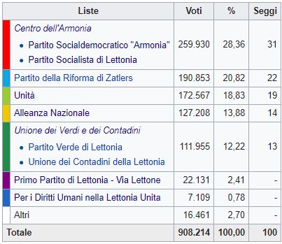 Per la prima volta nella breve storia della Lettonia indipendente, un partito filorusso, Saskaņas centrs (Centro dell’Armonia), ha vinto le elezioni politiche, ottenendo il 28 per cento dei voti e staccando nettamente gli altri partiti: sarà la forza di maggioranza relativa nel prossimo parlamento. Vienotiba (Unità), il partito di centrodestra del premier Valdis Dombrovskis, che negli ultimi tre anni di governo ha portato fuori il paese da una gravissima crisi economica aumentando le tasse e producendo fortissimi tagli alla spesa pubblica, ha pagato la politica di sacrifici imposta al paese, perdendo un terzo dei suoi consensi e finendo al 18 per cento. SC è il partito di riferimento dei russofoni, che in Lettonia sono circa il 30 per cento della popolazione. Finora in Parlamento era stato sempre all’opposizione, anche se da due anni è al potere a Riga e il suo candidato premier è proprio il sindaco Nils Ušakovs.