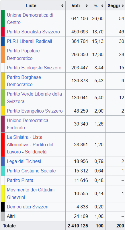 Ma i veri perdenti sono i due partiti storici di centro – il Partito popolare-democratico (Ppd) ed il Partito liberale-radicale (Plr), oltre che i Verdi che non hanno incassato l’effetto «Fukushima». Secondo le proiezioni – che riguardano il voto per il Consiglio Nazionale (camera bassa) eletto al proporzionale – il Plr è al 15,0% circa (meno 2,4% ) ed arretra anche il Ppd (meno 1,4 punti al 13%). I Verdi scendono all’8 %, (meno 1,7%). Secondo le prime analisi i primi cinque partiti sono gli stessi di prima e non cambiano nemmeno i rapporti di forza relativi. La novità nelle elezioni del Consiglio nazionale è rappresentata dall’affermazione degli «astri nascenti» e dal «nuovo centro», formato da Verdi liberali e dal Partito borghese democratico. In base alle proiezioni, i Verdi liberali balzano al 5,3% ed il Pbd (che non esisteva ancora quattro anni fa) si attesta al 5,2%. In Ticino e a Ginevra, i populisti hanno guadagnato punti.