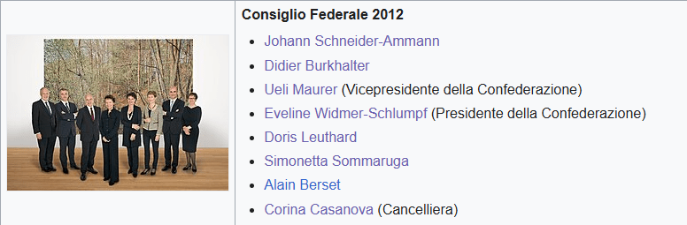 Plr: Didier Burkhalter, Johann Schneider-Ammann Ps: Simonetta Sommaruga, Alain Berset Ppd: Doris Leuthard, Corina Casanova Udc: Ueli Maurer Pbd: Eveline Widmer-Schlumpf