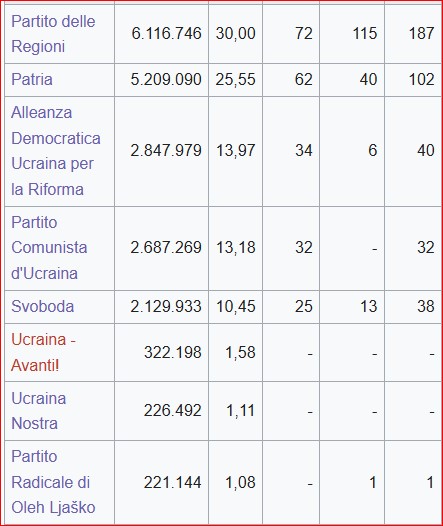 Secondo la Commissione Centrale Elettorale il Partito delle Regioni del presidente Viktor Yanukovych è in testa col 32 per cento dei voti, seguito dall’alleanza di opposizione di Timoshenko col 24,08 per cento dei voti. Il Partito Comunista è diventato la terza forza del paese superando il 13 per cento, seguito da Udar del pugile Vitali Klitschko (13,44 per cento) e dal partito nazionalista Svodoba al 9,52 per cento, partito di destra più moderno che è andato molto bene nella parte occidentale del paese e ha rappresentato la vera sorpresa di queste elezioni. Il partito dell’ex calciatore Andriy Shevchenko, “Avanti Ucraina”, non ha superato la soglia di sbarramento del 5 per cento e per questo motivo non prenderà seggi in parlamento. Anche il partito Nostra Ucraina dell’ex presidente Viktor Janukovich è diventato extra parlamentare crollando all1,11%. Le percentuali si riferiscono ai seggi distribuiti in base al sistema proporzionale (225 su 450). Per avere un quadro preciso della nuova Rada bisognerà aspettare i risultati definitivi che assegneranno gli altri 225 seggi con il maggioritario a collegi uninominali.
