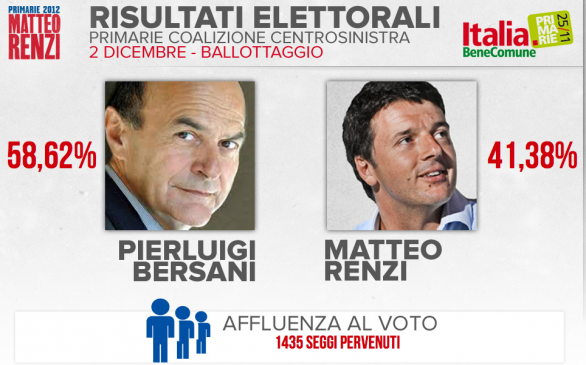 Il segretario del Partito Democratico Pier Luigi Bersani ha vinto le primarie del centrosinistra. I dati non sono ancora definitivi, ma l’esito è chiaro. Dopo lo scrutinio di oltre 8.100 seggi su 9219 le preferenze per Bersani sono al 61,8 per cento, mentre per Matteo Renzi ha votato il 38,8. Il sindaco di Firenze ha ammesso la sconfitta, prima via twitter, poi durante il suo discorso al quartier generale della Fortezza da Basso: “Bersani ha vinto nettamente, gli ho fatto i complimenti”. E il vincitore, pochi minuti dopo, ha ammesso: “Non mi aspettavo un successo di queste proporzioni, ma sono sempre stato tranquillo”. Il segretario ha ringraziato pubblicamente Laura Puppato, Bruno Tabacci e ha dedicato un saluto “particolarissimo” a Nichi Vendola.