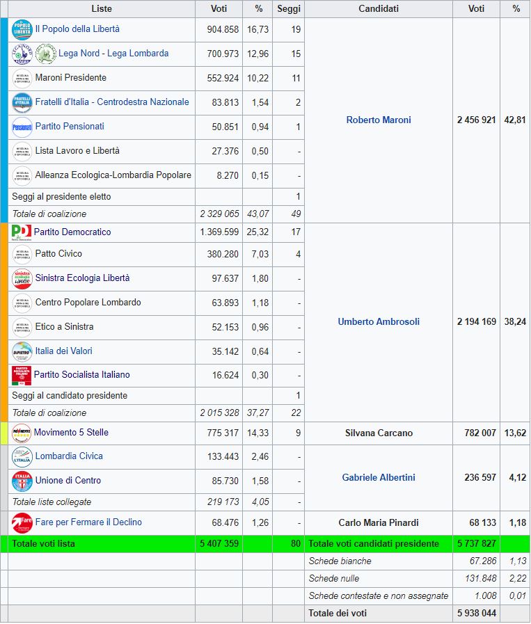 È Roberto Maroni a conquistare il Pirellone. A Umberto Ambrosoli non è bastato dominare a Milano – dove vola al 48 per cento – e in tutta la provincia. Non è riuscito a sfondare nelle altre province. Il candidato della Lega e del Pdl vince con il 43 per cento. Per l’ ex sindaco Gabriele Albertini è un flop: la percentuale che raggiunge alle Regionali è attorno al 4 per cento, meno della metà del risultato di Monti alle Politiche. Con questo esito, il suo gruppo non potrebbe non entrare neppure in Consiglio regionale. Anche la candidata del Movimento 5 Stelle, Silvana Carcano, si ferma al 13 per cento, molto al di sotto dei livelli dei grillini alla Camera e al Senato. Dopo la vittoria, il leader della Lega ha esultato: «Missione compiuta, ora la macroregione del Nord». Dal verde al blu del cielo di Lombardia: cambio di sfondo nella sala stampa allestita nella sede della Lega di via Bellerio per seguire i risultati delle elezioni regionali. Lunedì, per l’ esito delle elezioni politiche, dominavano i cartelloni bianchi con scritta verde «Prima il Nord», ieri sono stati invece portati in sala stampa i cartelloni con la scritta bianca «La Lombardia in testa», su sfondo blu, che hanno accompagnato Maroni nella campagna elettorale per la corsa a Palazzo Lombardia.