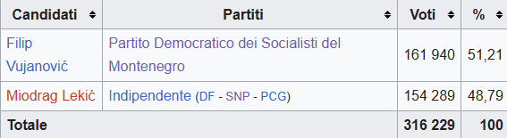 E, alle presidenziali del 7 aprile 2013, è stato proprio Vujanović a vincere, seppur per un pugno di voti (51,2%) contro il suo unico sfidante, il candidato unico di tutta la (frammentata) opposizione montenegrina: l’ex diplomatico Miodrag Lekić. I sostenitori politici di Lekić hanno, domenica sera, rivendicato la vittoria per sé, richiedendo un informale riconteggio delle schede annullate, però il risultato è stato confermato dalla Commissione Elettorale nella serata del lunedì. Il risultato evidenzia che Paese, avvolto dalle spire della crisi economica, è indubbiamente spaccato e quasi equamente diviso tra il programma di Vujanić (massimo impegno per l’ingresso del Montenegro nell’UE e nella NATO) e quello di Lekić (massimo impegno nella lotta alla criminalità legalizzata e alla corruzione, identificate come prime fonti di problemi). Lo stesso Đukanović (con alle spalle un processo – a Napoli – per corruzione; processo lasciato decadere nel 2009), a questo punto, non può permettersi di difendere troppo il suo alleato: è a rischio la governabilità del Paese e non è detto che le nuove elezioni possano arridere a lui e al DPS.Situazione già vista