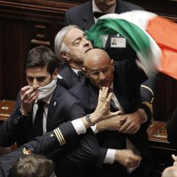 Subito dopo il via libera in aula è scoppiata una bagarre. I Cinque stelle imbavagliati, con fischietti e cartelli hanno assalito il banco del governo dopo che la Boldrini ha annunciato la “ghigliottina” al decreto. Un enorme cartello con scritto “corrotti” é stato srotolato sotto lo scranno del presidente. I commessi già schierati a difesa dei banchi del governo hanno cercato di bloccare i ‘grillini’ che gridavano ‘fascisti fascisti’. E anche i deputati di Fratelli d’Italia hanno issato un tricolore. La presidente, dopo una velocissima votazione, ha chiuso la seduta ma i grillini sono rimasti ancora in aula. I deputati di Sel dopo il voto finale hanno cantato a squarciagola “Bella Ciao”. A seduta sospesa nessuno abbandona l’Aula. I Cinque Stelle hanno risposto cantando l’Inno di Mameli. Poi il M5S ha occupato l’aula e i deputati stellati hanno annunciato che «non tornerannio pacificamente in aula». Un video pirata girato in aula è stato pubblicato sul sito di Grillo.