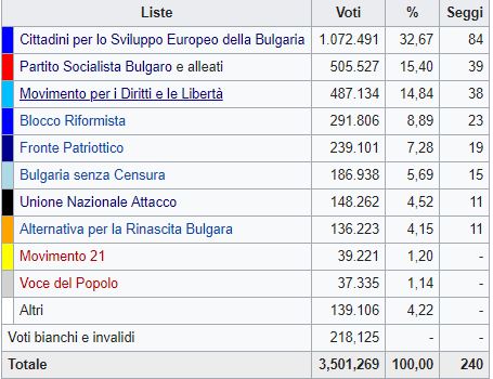 grande rivale, il partito socialista bulgaro (Bsp) – reduce da un governo in coalizione con il partito della minoranza turca Dps rimasto al potere per poco più di un anno – tocca invece il minimo storico, al 16 per cento, seguito dal Dps che raccoglie il 14% dei voti.