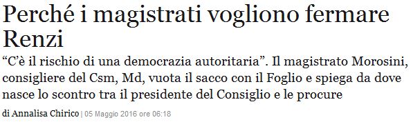 Questo è parlare chiaro. Finalmente. Qual è il problema? Semplice: fermare Renzi. Non tra virgolette come nel titolo del Foglio, ma nella sostanza come emerge chiaramente dal pensiero (non smentito) dell’intervistato. E bisogna dire grazie al giudice Piergiorgio Morosini, membro del Csm, che ha messo un punto fermo al dibattito: il Pd è vittima di un complotto? Macché complotto: solo una normale, stucchevole battaglia politica. Peccato che a farla non sia il potere giusto, come sancito da un altro pensatore che incomincia con Mo, come Morosini, ma che finisce meglio, cioè Montesquieu. Peccato che sia la magistratura ancora una volta a invadere un terreno che non è il suo, usando l’arma impropria della intangibilità, affilata come una ghigliottina. Uno sconfinamento, per essere carini. Una indecenza, per essere seri. Non perché il Palazzo non sia popolato di ladri e corrotti su cui deve fiammeggiare la lama della giustizia. Ci mancherebbe.