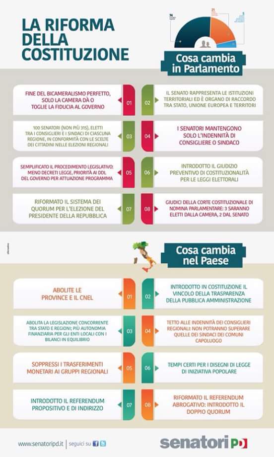Due provvedimenti legislativi in Italia hanno fatto eco in tutta Europa per la loro approvazione: le unioni civili e la riforma costiruzionale. La legge sulle unioni civili inserisce nel diritto di famiglia un nuovo istituto specifico per le coppie omosessuali, chiamandolo unione civile, diverso dal matrimonio regolato dall’articolo 29 della costituzione. Per stipulare un’unione civile, le due persone devono essere maggiorenni e recarsi con due testimoni da un ufficiale di stato civile. L’ufficiale provvede alla registrazione. Non possono contrarre l’unione civile persone già sposate o che hanno già contratto un’unione civile; persone a cui è stata riconosciuta un’infermità mentale o persone che tra loro sono parenti. Il disegno di legge prevede il riconoscimento delle convivenze, sia tra omosessuali sia tra eterosessuali. Il ddl Boschi sulla riforma costituzionale è stato approvato dalla Camera con 361 voti a favore e 7 contrari. Con la sesta e ultima votazione il provvedimento, secondo quanto previsto dall’articolo 138 della costituzione, non avendo ottenuto la maggioranza di due terzi dei componenti di ciascuna Camera, può essere sottoposto a referendum popolare. L’ultima parola quindi spetterà ai cittadini. Con l’approvazione del ddl finisce di fatto il bicameralismo paritario su cui si basa la nostra Costituzione. In concomitanza con la seduta della Camera per il voto finale è sceso in piazza davanti a Montecitorio il Comitato per il “No a al referendum costituzionale” che accusa il governo Renzi di voler stravolgere la Costituzione così come era stata concepita dai padri costituenti, con la divisione dei tre poteri, legislativo, esecutivo e giudiziario. “Con la discussione generale è un iniziato ieri alla Camera il percorso che porterà all’approvazione definitiva della riforma Renzi-Boschi che stravolge la Costituzione nata dalla Resistenza. Una riforma voluta, anzi imposta al parlamento dal governo, che ora vuole utilizzare il referendum a fini plebiscitari. Il combinato disposto delle pretese riforme della Costituzione e della legge elettorale cambiano la sostanza della nostra Repubblica, fondata sulla centralità del Parlamento e avviano un processo che punta alla instaurazione di una sorta di premierato assoluto”.