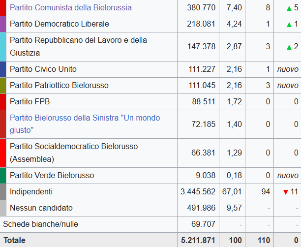 Gli alleati di Lukashenko, che dal 1994 ha un saldo controllo sull’ex repubblica sovietica di 9,5 milioni di abitanti, hanno dominato le elezioni di domenica 11 settembre, ottenendo 108 dei 110 seggi totali in Parlamento. Due membri dell’opposizione, una donna del filo-occidentale Partito civile unito e un indipendente dell’associazione non governativa Società per la lingua bielorussa, hanno ottenuto un seggio ciascuno: ed è una notizia. La Bielorussia è stata criticata diverse volte dall’Organizzazione per la Sicurezza e la Cooperazione in Europa (OSCE), che si occupa anche di vigilare sulle elezioni, per le sue elezioni non democratiche. «In Bielorussia non ci sono elezioni libere e democratiche», ha detto per telefono Anatoly Lebedko, capo del Partito civile unito, che martedì deciderà se Anna Kanopatskaya [la donna eletta per il partito] accetterà il mandato o lo rifiuterà in segno di protesta. «Le autorità hanno controllato totalmente il processo di voto», ha aggiunto Lebedko.