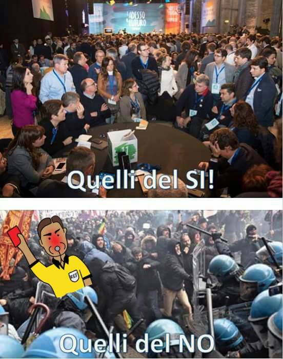 Adesso si è al punto che ci vuole una rivolta per votare no e poterlo mandare a casa, con la speranza di riportare al potere un governo come quelli… sani che lo hanno preceduto. “Votare no per mandare a casa Renzi, di duce ne è già bastato uno” “Votare si meno poltrone, meno burocrazia, meno corruzione ” Questi sono i ritornelli che vanno per la maggiore. A dire il vero, mi espongo e sarei per il sì, perché se ci troviamo in queste condizioni è per colpa dei governi precedenti, colpa di tutte le promesse mai mantenute, le quali hanno frenato il progresso delle riforme che Renzi e il suo governo sta cercando di rimediare e di riportare il nostro paese alla ragione. Quindi io sono per sì per poter cambiare e migliorare l’Italia cui vivo, che si trova ingessata da oltre vent’anni da un sistema legislativo lento, molto lento. Abbiamo bisogno del cambiamento, se col no si manda a casa il solo Renzi (come ripicca), io voto sì per mandare a casa molta più gente, gente superflua, ovvero il taglio dei senatori, dei costi della politica. Votare sì vorrebbe dire stare dalla parte di chi vuoi cambiare in meglio la nostra Italia e non stare con chi l’ha rovinata.