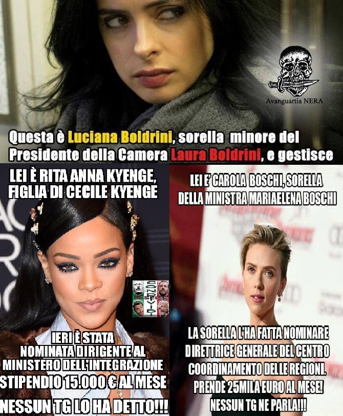 Quest’estate in Rete spopola un esperimento sociale. Prendi un personaggio famosissimo; fingi che sia il parente di un politico italiano e ti inventi che assuma un ruolo istituzionale spesso inesistente (ovviamente senza nessun merito, solo grazie alla parentela). Si arriva così, per esempio, alla sorella deceduta della Boldrini, alla sorella inesistente della Boschi o alle figlie minorenni della Kyenge.