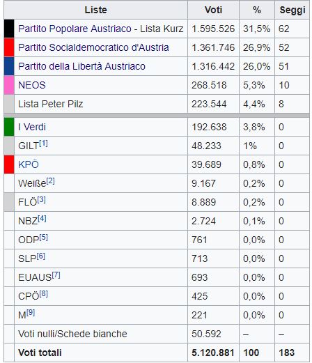 Batosta per i Verdi, finiti al momento sotto la soglia di sbarramento del 4%, al 3,9%, dunque fuori dal Parlamento. Mentre i Neos e la lista di Peter Pilz, nata da uno scissionista dei Verdi, si assestano rispettivamente al 5,1% e al 4,3%.