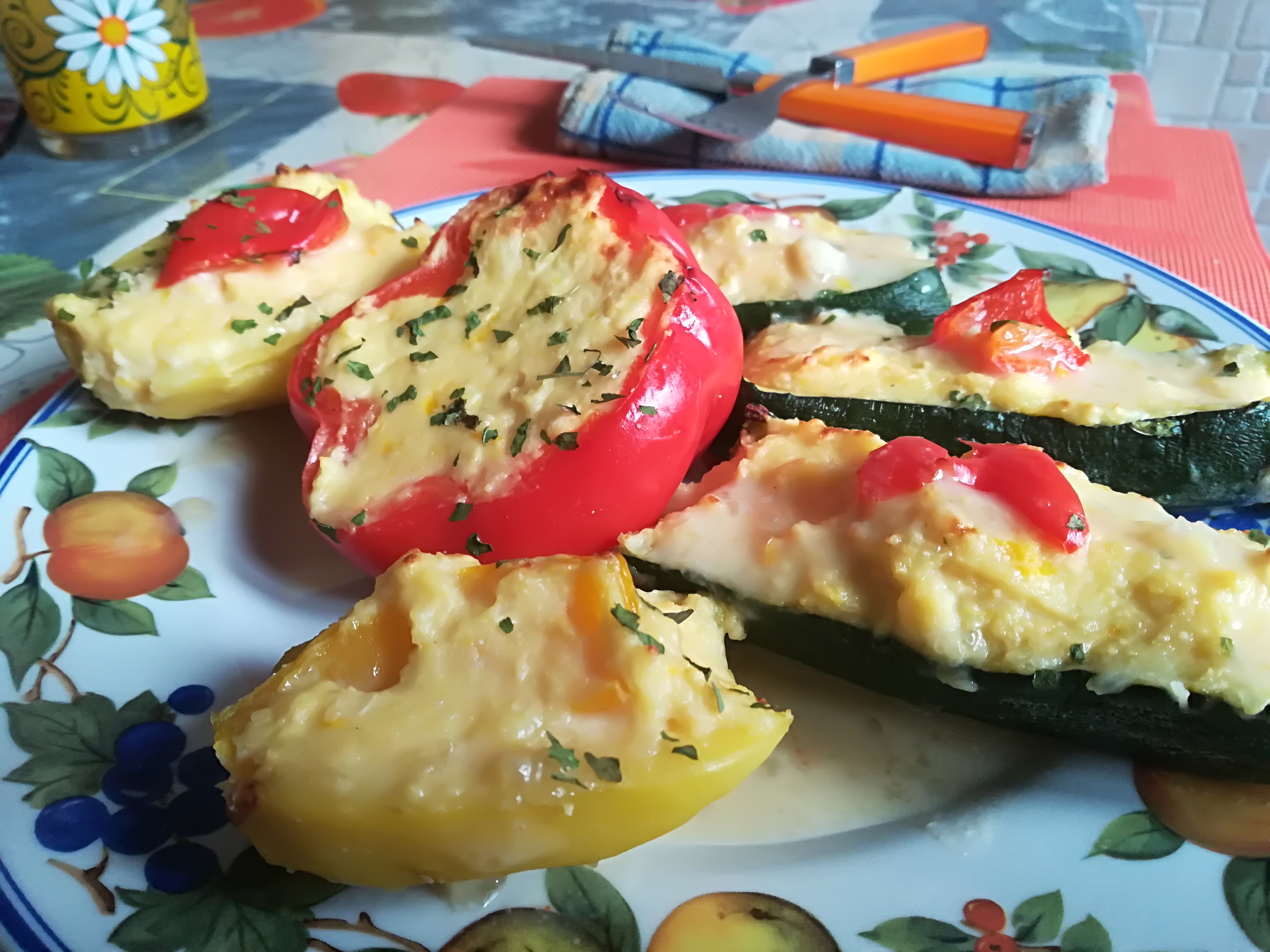 Ingredienti: peperoni, zucchine, pangrattato, formaggio grattuggiato, aglio, spezie a piacere, olio evo.
