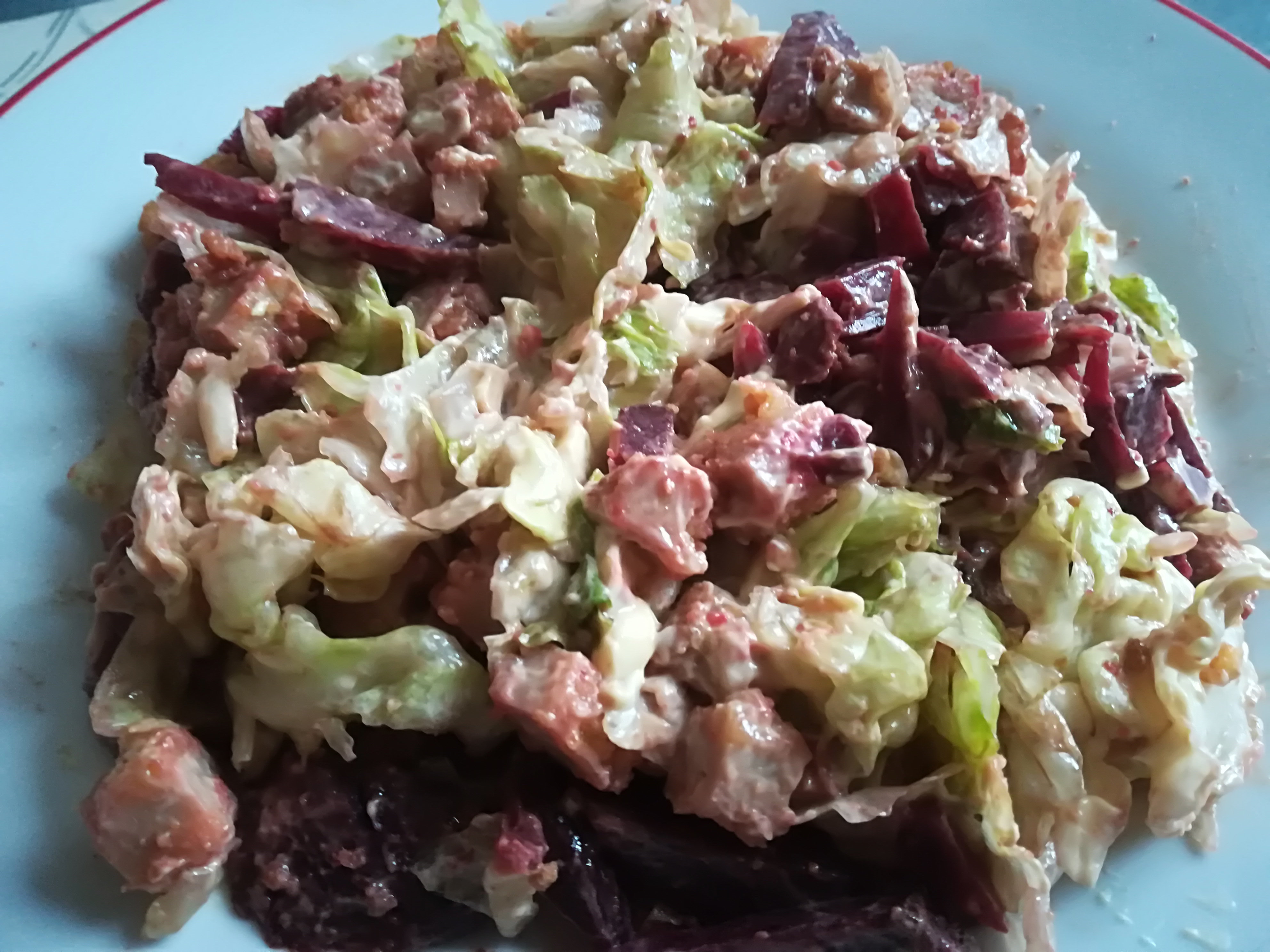 Prendete la cotoletta e cuocetela in un tegamino come fareste normalmente. Mettetela su un tagliere, tagliatela in quadratini e deponete questi ultimi in un’insalatiera. Prendete due/tre foglie d’insalata (meglio se iceberg) e tagliatela a mano e in modo grossolano in piccoli pezzi e mettete anche questi nell’insalatiera. Prendete una barbabietola e tagliatela a cubetti e mettetela nell’insalatiera. Non esagerate con questo ingrediente, in quanto se in dimensioni troppo abbondanti tende a coprire il gusto degli altri sapori. Inserite, infine, nell’insalatiera un poco d’olio e un cucchiaio di maionese. Girate bene il tutto e servite in tavola.