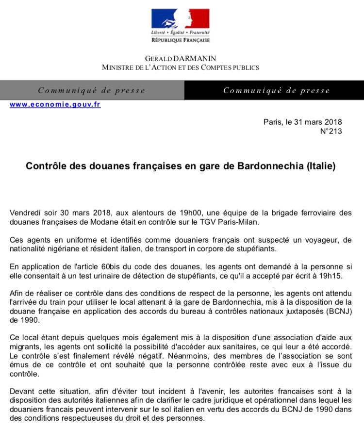 “Applicando l’articolo 60bis del codice delle dogane – si legge ancora – gli agenti hanno chiesto alla persona se consentiva a un test urinario per la rilevazione di stupefacenti, cosa che è stata accettata per iscritto alle 19.15. Al fine di realizzare questo controllo in condizioni di rispetto della persona, gli agenti hanno atteso l’arrivo del treno per poter utilizzare il locale attenente alla stazione di Bardonecchia, messo a disposizione della dogana francese in applicazione degli accordi sugli uffici a controlli nazionali giustapposti (BCNJ) del 1990”.