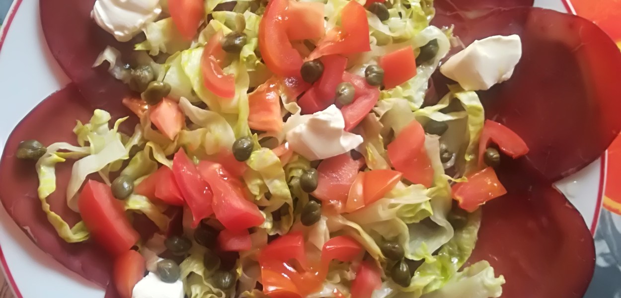 Insalata di pomodori e capperi su fiore di bresaola