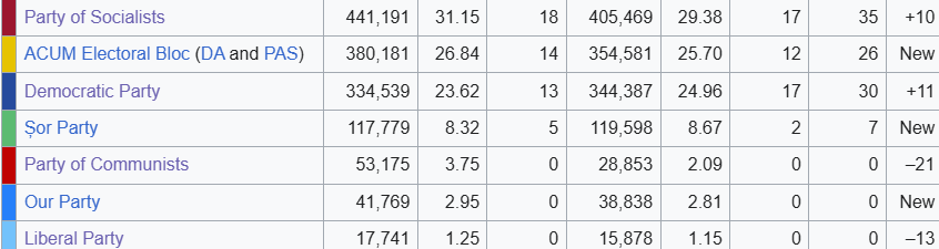 L’affluenza è stata di poco superiore al 49 per cento, la più bassa da quando la Moldavia diventò indipendente nel 1991. Per sapere cosa succederà adesso bisognerà aspettare i risultati definitivi e soprattutto il conteggio dei seggi: il sistema elettorale è infatti per metà proporzionale e per metà maggioritario, basato su collegi uninominali. La composizione del Parlamento potrebbe quindi essere diversa da quella delle percentuali complessive: la legge elettorale, introdotta nel 2017 e criticata tra gli altri dal Parlamento Europeo, dovrebbe favorire il PSRM e il PDM, partiti più vecchi e radicati sul territorio, e quindi più adatti a vincere in collegi uninominali.