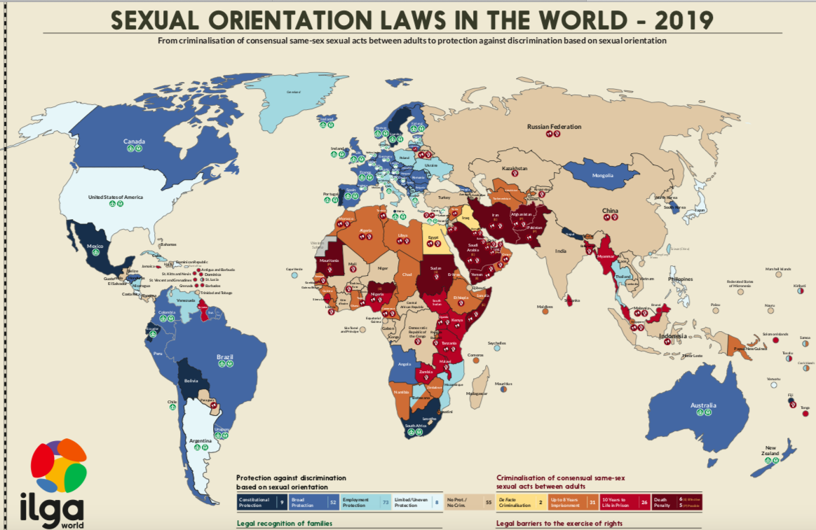 Lo studio testimonia come a marzo 2019 siano 68 i Paesi in cui i rapporti omosessuali consensuali sono puniti per legge. Africa: Algeria, Botswana, Burundi, Ciad, Cameron, Comore, Eritrea, Eswatini, Etiopia, Gambia, Ghana, Guinea, Kenia, Liberia, Libia, Malawi, Mauritania, Mauritius, Marocco, Namibia, Nigeria, Senegal, Sierra Leone, Somalia, Sud Sudan, Sudan, Tanzania, Togo, Tunisia, Uganda, Zambia, Zimbabwe. Caraibi: Antigua, Barbados, Dominica, Grenada, Guyana, Giamaica, Saint Kitts e Nevis, Saint Lucia, Saint Vincent and Grenedines. Asia: Afghanistan, Arabia Saudita, Bangladesh, Buthan, Brunei, Emirati Arabi Uniti, Indonesia, Iran, Kuwait, Libano, Malaysia, Maldive, Myammar, Oman, Pakistan, Palestina, Qatar, Singapore, Sri Lanka, Syria, Turkmenistan, Ubzekistan, Yemen. Oceania: Kiribati, Papua Nuova Guinea, Samoa, Salomone, Tonga, Tavalu.