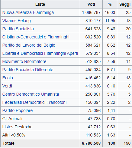 Nelle Fiandre la Nuova Alleanza Fiamminga (N-VA) rimane il più grande partito su tutti e tre i livelli. Tuttavia, ha perso alcuni punti in ognuno di essi. Interesse Fiammingo (VB) è il secondo partito, ma è il chiaro vincitore, con un aumento di 12,5 punti percentuali sui tre livelli elettorali. In Vallonia, la stessa dinamica si riflette a sinistra. Il Partito Socialista (social-democratico) rimane il primo partito, ma perde tra i 3 e i 5 punti sui tre livelli. Il suo avversario di sinistra radicale, il Partito comunista laburista (PTB), è cresciuto di circa 9 punti, con risultati tra il 14% e il 15% sui tre livelli. Infine il partito ecologista vallone Ecolo è cresciuto tra il 6% e l’8%.