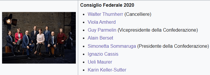 Plr: Ignazio Cassis, Karin Keller-Sutter Ps: Simonetta Sommaruga, Alain Berset Ppd: Walter Thurnherr, Viola Amherd Udc: Ueli Maurer, Guy Parmelin