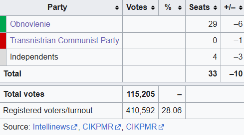La mattina del 30 novembre, la Commissione elettorale centrale della Transdniestria ha pubblicato i risultati preliminari delle elezioni del Soviet Supremo (parlamento locale). Secondo la lista, in 31 delle 33 circoscrizioni hanno vinto deputati in carica, sostenitori o membri del partito del Rinnovamento. Va notato che in 23 circoscrizioni si sono svolte elezioni non alternative: un solo candidato per ciascuna.
