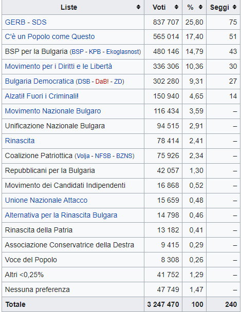 Finora GERB aveva governato con un’alleanza di partiti nazionalisti, Patrioti Uniti, che però si è sciolta. Domenica il principale di questi partiti nazionalisti, il Movimento nazionale bulgaro (VMRO), ha preso solo il 3,6 per cento: GERB avrà quindi bisogno di trovare altri alleati.