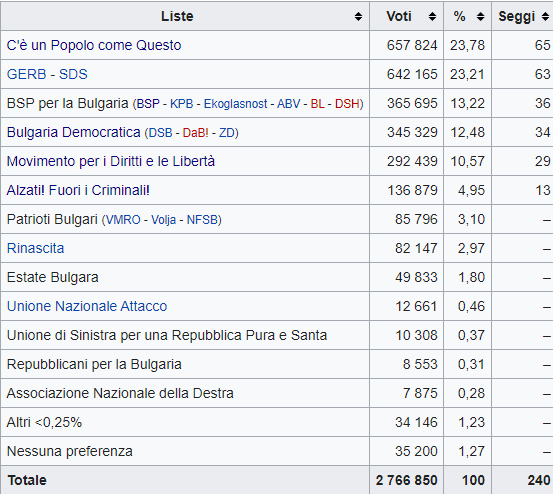 Secondo i risultati parziali delle elezioni in Bulgaria che si sono tenute domenica 11 luglio, nessun partito ha ottenuto abbastanza voti per governare. Con circa il 95 per cento dei voti scrutinati, il partito Cittadini per lo sviluppo europeo della Bulgaria (GERB, di centrodestra) dell’ex primo ministro Boyko Borisov è al 23,91 per cento. Il partito populista “C’è un tale popolo” (ITN), fondato nel 2020 dal popolare presentatore televisivo, cantante e comico Slavi Trifonov, è al 23,66 per cento. Il Partito socialista, che fino a qualche mese fa era il maggiore partito di opposizione, risulta invece al terzo posto con il 13,63 per cento dei voti.