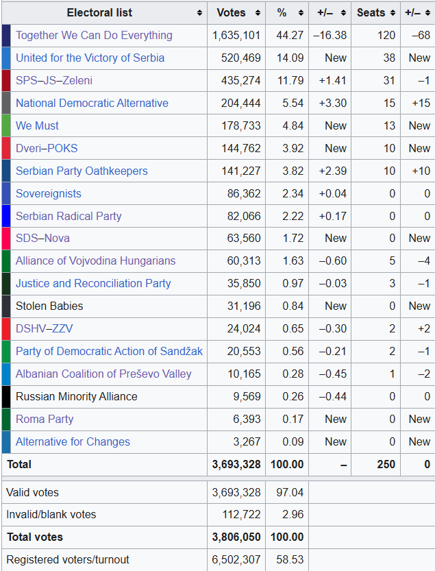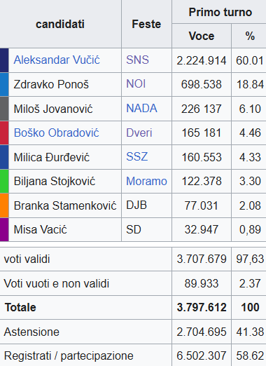 Vucic si è detto orgoglioso di aver vinto le presidenziali per la seconda volta al primo turno, sottolineando come il suo successo sia andato ben oltre quello conseguito dai suoi predecessori Tomislav Nikolic e Boris Tadic, che al primo turno ottennero rispettivamente circa 950 mila e 850 mila voti. Il presidente rieletto ha ringraziato anche i serbi del Kosovo e quelli della Republika Srpska, che hanno votato per lui al 90%.
