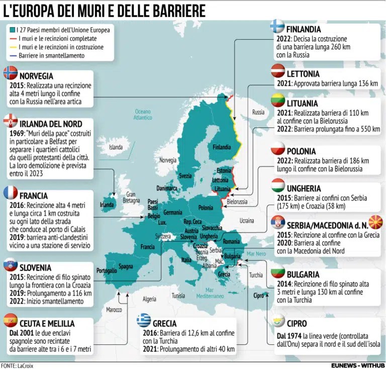 A proposito di muri al confine con Russia e Bielorussia, il governo della Finlandia ha ricevuto il via libera informale di tutti i partiti rappresentati in Parlamento di presentare la proposta per la costruzione di una recinzione di acciaio di 260 chilometri, che coprirà un quinto della lunghezza totale del confine con la Russia. Anche Norvegia, Estonia e Lettonia hanno già completato barriere al confine con la Russia, mentre quest’estate sono state ultimate quelle di Lituania e Polonia al confine con la Bielorussia, con la Lettonia che ha annunciato una recinzione di filo spinato di 136 chilometri in fase di costruzione.