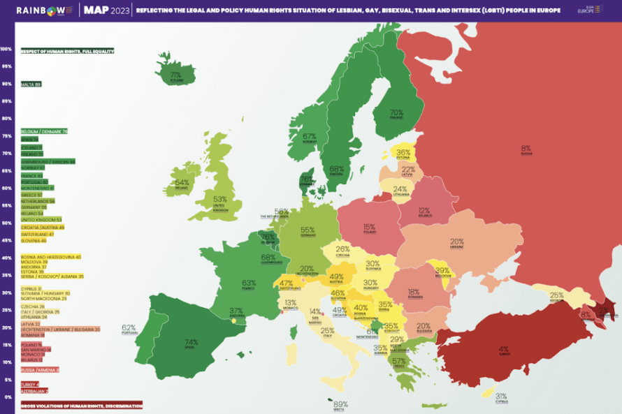 Davanti a tutti, per l’ottavo anno consecutivo, Malta, seguito da Belgio, Danimarca e Spagna, in grandissima crescita con un balzo di ben 6 posizioni. D’altronde negli ultimi 12 mesi la Spagna ha introdotto una legge che regola il riconoscimento legale del genere (LGR) basato sull’autodeterminazione, ha vietato le mutilazioni genitali sui minori intersessuali, le cosiddette pratiche di “conversione” e la discriminazione basata sull’orientamento sessuale, l’identità di genere e le caratteristiche sessuali.