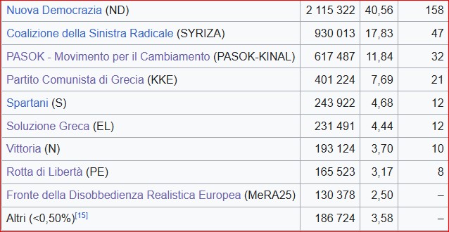 I risultati delle elezioni tenute ieri in Grecia per eleggere il Parlamento vedono, con il 99,62% dei voti scrutinati, il Partito Nea Dimokratia al 40,52% dei voti e 158 seggi (su 300) e il partito di sinistra Syriza guidato da Alexis Tsipras al 17,84% e 48 seggi: lo riporta il sito di Kathimerini, secondo cui l’affluenza è stata del 52,83%.