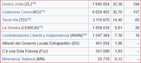 L’alleanza di centro-destra Terza Via, che ha dichiarato di volersi coalizzare con la Ko, ha ottenuto il 14,40% e quella social-democratica La Sinistra, altro partner di Tusk, l’8,61%. Il partito di estrema destra Confederazione, che non intende allearsi con il Pis, con il 7,16% è l’ultima delle cinque formazioni che hanno superato le soglie di sbarramento ed entrano nel Sejm, la decisiva Camera bassa del parlamento polacco. I risultati finali hanno uno scostamento massimo di meno di due punti rispetto all’exit poll di domenica sera.