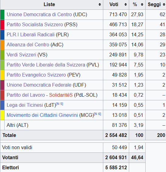 Il Partito Socialista Svizzero è secondo con 41 seggi, due in più rispetto alle ultime elezioni. Risultato quasi identico per l’Alleanza di Centro e per i Liberali Radicali (PLR) entrambi al 14,6 per cento. Il partito che perde più voti e considerato lo sconfitto di queste elezioni federali sono i Verdi, in calo di oltre 4 punti percentuali e con 7 seggi in meno rispetto al 2019. I 200 deputati del Consiglio Nazionale e i 46 del Consiglio degli Stati (eletti in rappresentanza dei cantoni) voteranno il 13 dicembre il nuovo governo. Poi si riuniranno quattro volte l’anno, in sedute che dureranno tre settimane ognuna.