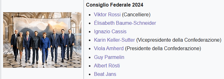Plr: Ignazio Cassis, Karin Keller-Sutter Ps: Élisabeth Baume-Schneider, Beat Jans Udc: Guy Parmelin, Albert Rösti AdC: Viola Amherd Pvl: Viktor Rossi