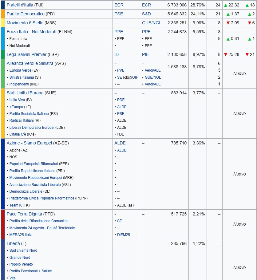 Questi risultati di fatto consegnano a Fratelli d’Italia il terzo posto come partito più numeroso al Parlamento europeo, dietro la Cdu, l’Unione dei cristiani e democratici tedesca, e il Rassemblement national di Marine Le Pen, mentre il Pd si appresta a diventare il primo partito nel gruppo dei socialisti, sopra il corrispettivo di Pedro Sanchez.