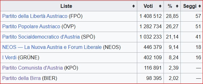 Il vero punto interrogativo riguarda, ora, la formazione del governo. Viene esclusa sulla carta l’alleanza tra Fpö e popolari. Il Parlamento che esce oggi dalle urne risulta fortemente frammentato, tanto che nessuna forza politica ha la maggioranza assoluta: l’ultradestra è la prima forza politica, con 57 seggi, secondi i popolari con 51, terzi i socialisti con 41, appaiati i Verdi e i liberali di Neos con 17 seggi ciascuno. Da oggi sono in programma i colloqui per la formazione dell’esecutivo.