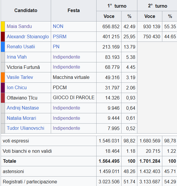Maia Sandu è stata finalmente rieletta dopo il secondo turno con oltre il 55% dei voti. Come i voti anti-UE nel referendum, Stoianoglo inizialmente era arrivato primo, prima che lo spoglio dei voti delle principali città e della diaspora portasse Sandu al primo posto . Come nel 2019, quest’ultimo ha goduto di un ampio sostegno da parte della diaspora, ma questa volta non ha vinto sulla base dei voti espressi nel paese stesso, dove Stoianoglo ha ottenuto il 51% dei voti .