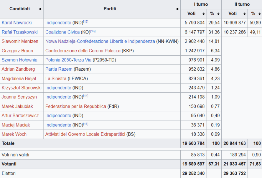 L’elettorato polacco, dunque, è apparso nettamente diviso in due. L’affluenza alle urne è stata del 72,8 per cento: più alta rispetto al primo turno del 18 maggio scorso, quando ci si era fermati al 67,3 per cento.