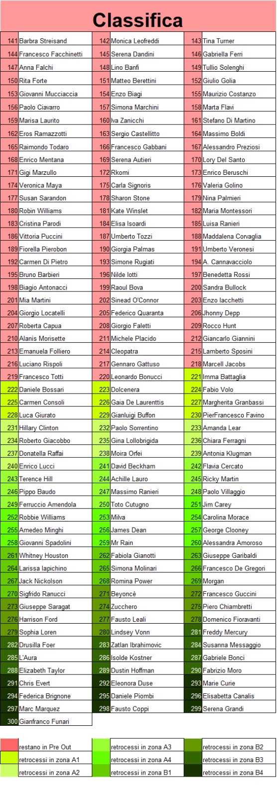 | girone superiore e vengono retrocessi i dieci personaggi con meno punteggio nel girone inferiore. Eccezione fanno le due estremità. Nell’ultimo girone vengono eliminati gli | ||||||