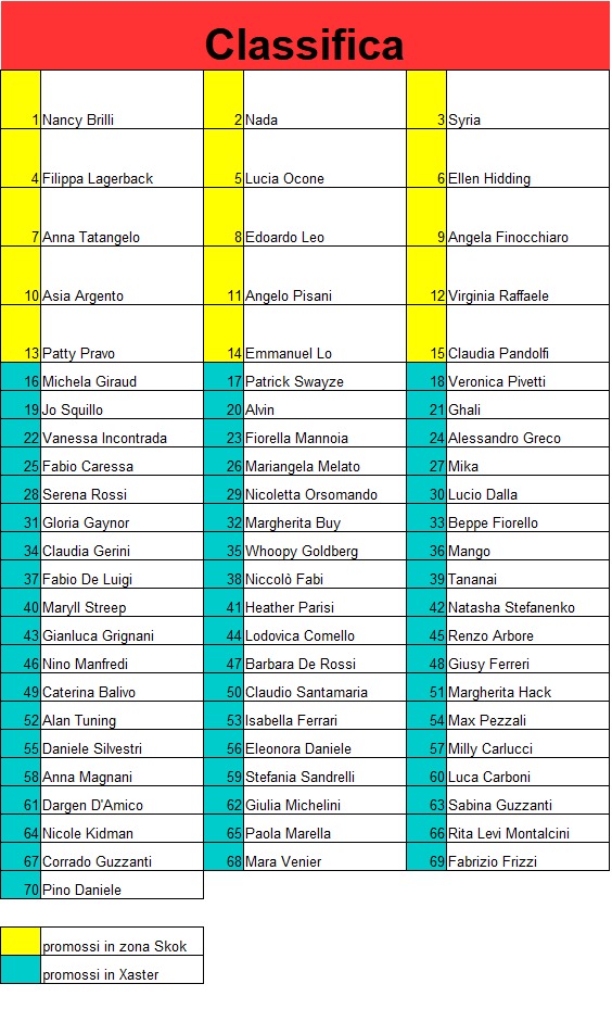 | promossi in Xaster | eliminati 46°/70° classificati) |