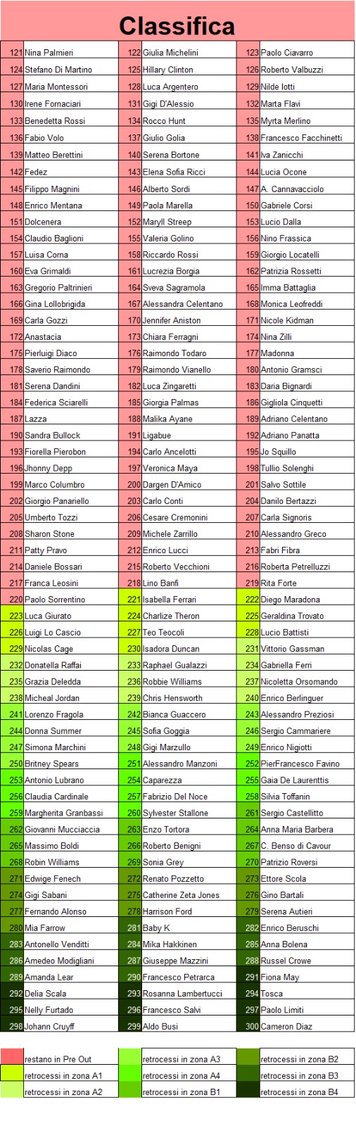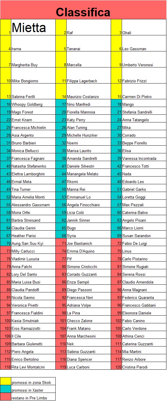 | dieci eliminazioni. Le promozioni (dieci a tappa) avvengono dalla quinta tappa in poi. I promossi a Pre Limbo sono 50. Punteggio PreMin (dieci scelte | ||||||||||||||