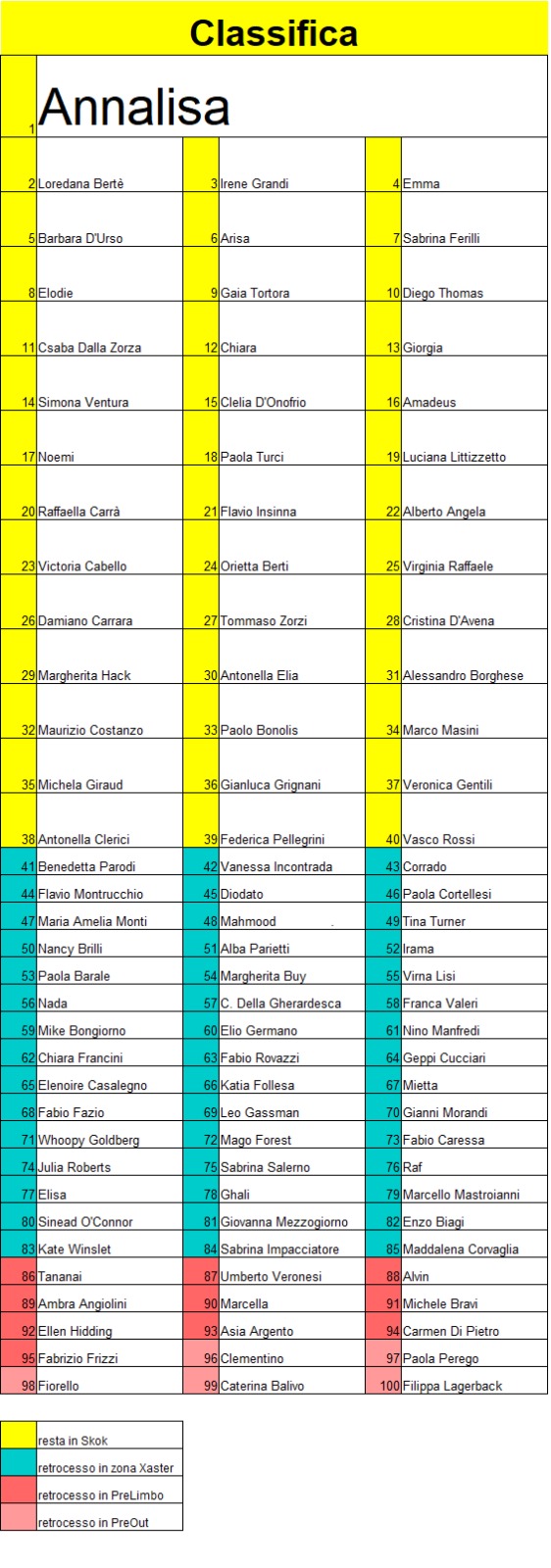 | classificati tra il 41esimo e l’85esimo posto vengono retrocessi nella zona Xaster del successivo ciclo e quelli tra 86esimo e il 100° posto vengono | |||||