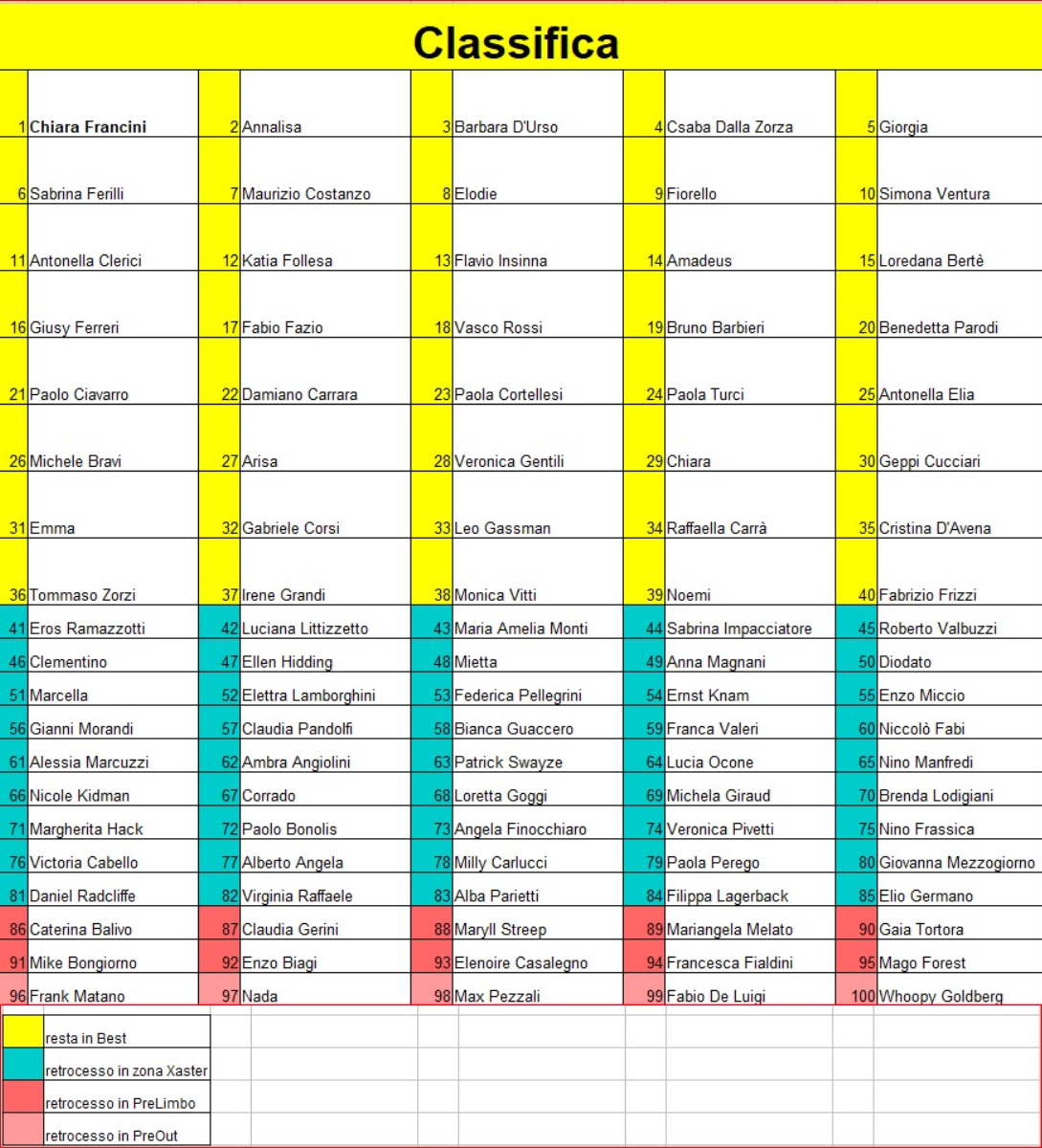 | Elodie 122 | Simona Ventura | 126 | Elodie | 122 | Emma | 127 | Fabio Fazio | 133 | Chiara Francini | 136 | Chiara Francini | 141 | Katia Follesa | 150 | Katia Follesa | 160 | Simona Ventura | 172 |