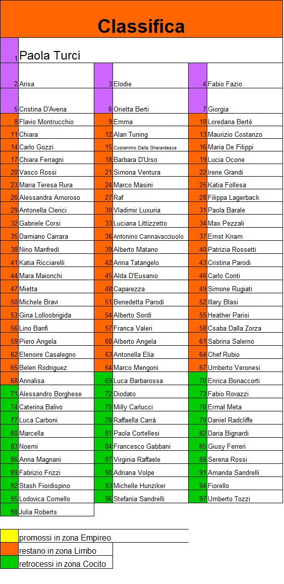 | I partecipanti sono 98. Trenta promossi dalla zona Cocito, sessantuno provenienti dalla zona Limbo e sette retrocessi | |||||